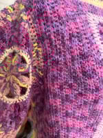 Tejido a mano con una delicada lana mohair degradé, este chaleco encarna la suavidad y el encanto de los tonos violetas y fucsias que se funden entre sí
