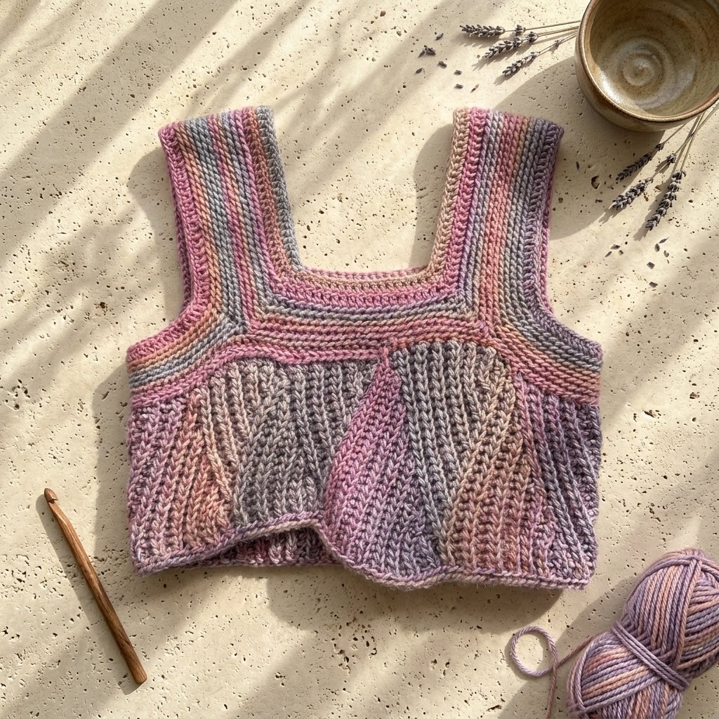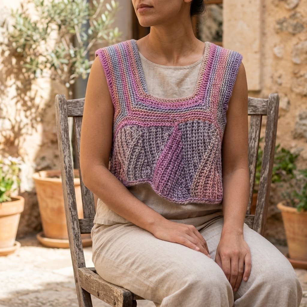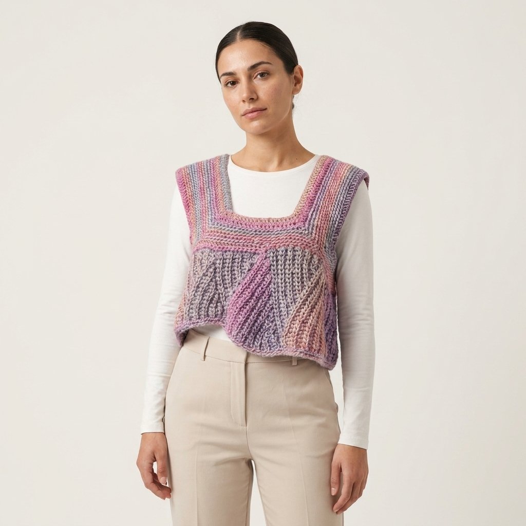 Chaleco de lana perteneciente a la serie Geometría, una colección en la que cada pieza nace de una forma básica y evoluciona hasta convertirse en una prenda única. Este diseño parte de un triángulo y se desarrolla de manera creativa y orgánica mediante la técnica del crochet, dando lugar a un chaleco de líneas marcadas, movimiento y una silueta muy especial.